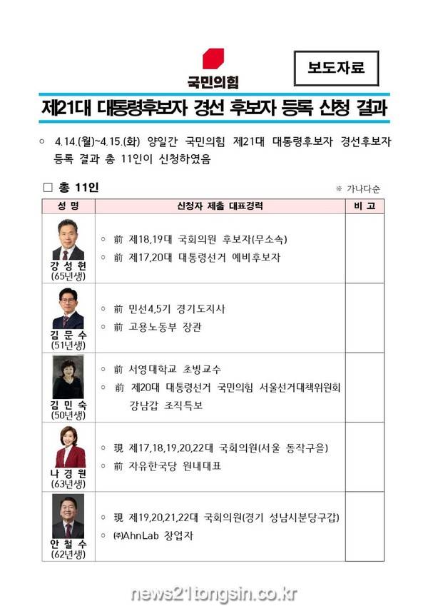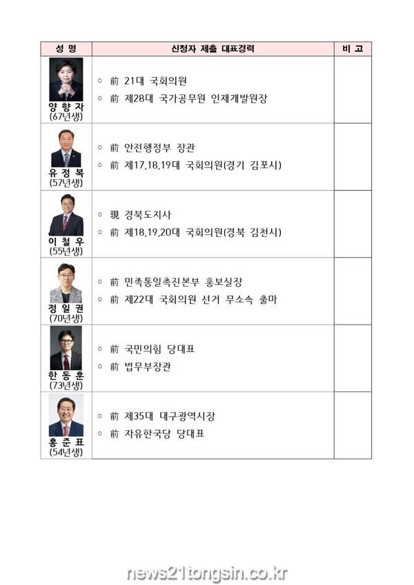 국민의힘 제21대 대통령후보자 경선 후보자 등록 신청 결과