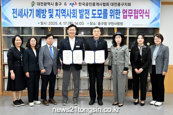 대전 중구(구청장 김제선)는 17일, 청내 구민사랑방에서 (사)한국공인중개사협회 대전광역시 중구지회와 전세사기 피해 예방 및 지역사회 발전을 위한 업무협약(MOU)을 체결했다고 밝혔다.