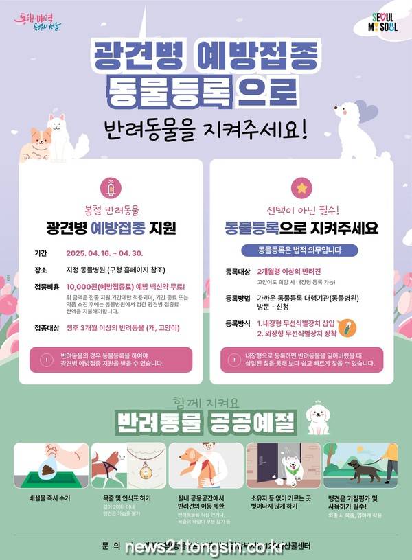 박강수 마포구청장은 “반려동물은 이제 우리 삶에서 떼려야 뗄 수 없는 존재가 되었다”라며, “광견병 예방접종은 소중한 반려동물과 구민의 안전을 위해 필요한 절차이므로 관심을 가지고 접종에 참여해 주길 바란다”라고 말했다.