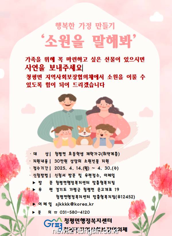 가평군 청평면지역사회보장협의체(지사협)는 가정의 달을 맞아 저소득층 아동을 위한 특화사업 ‘소원을 말해봐’를 추진한다고 18일 밝혔다.