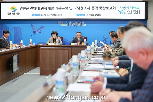 이번 중간보고회에서는 연천군 전망대 관광자원화 및 활성화를 위한 발전방향과 전망대 리뉴얼, 인근 지역과의 연계발전을 위한 전략 수립 등 전망대 관광개발 기본구상 진행 상황을 공유하는 자리가 마련되었다. 특히 각 전망대 관할 부대인 5사단, 25사단 관계자가 참석하여 전망대 개발에 대한 열띤 토론을 벌였다.