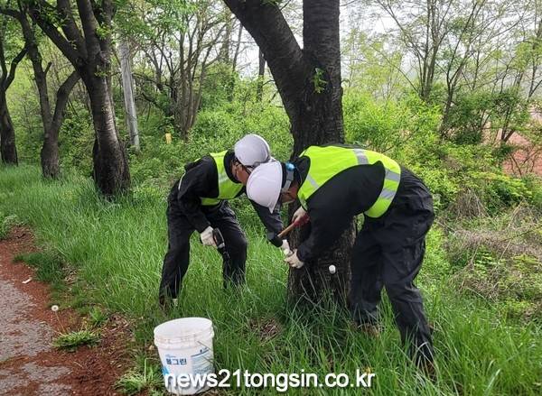 가로수 미국흰불나방 수간주사 사업은 매년 2~3회 발생하는 가로수 흰불나방 피해를 사전에 예방하기 위한 사업으로, 수목 1주당 1~2개의 수간약제를 주입하는 사업이다. 금회 시행하는 가로수는 왕벚나무, 이팝나무 총 5,300주로 수간주사 주입 시 흰불나방 피해를 저감할 수 있다.