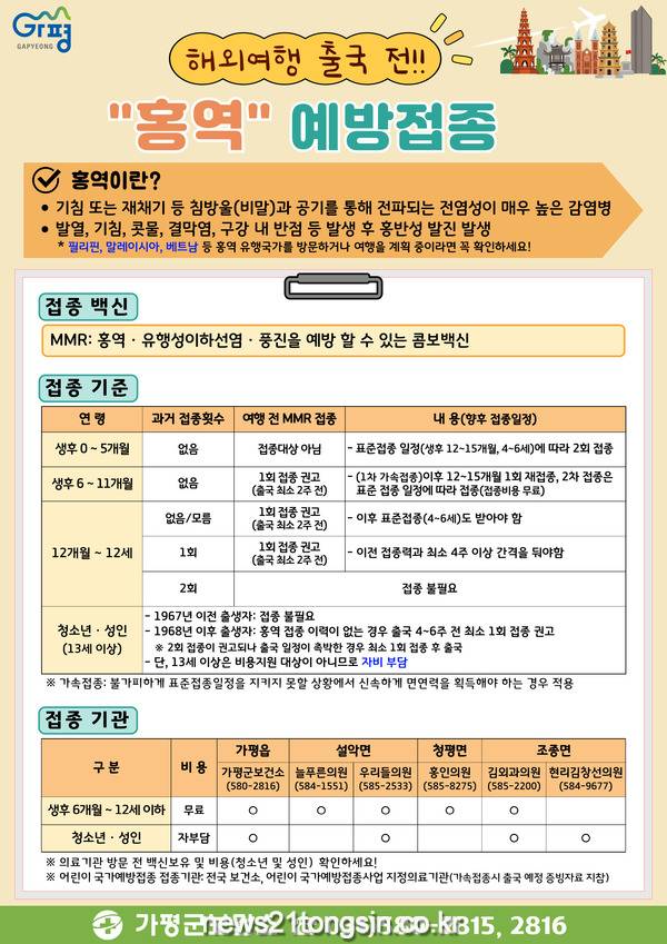 ▲ 사진=가평군가평군(군수 서태원)은 최근 해외에서 홍역이 유행함에 따라 홍역 유행 국가 여행시 출국 전 꼭 예방접종을 받을 것을 권고했다.