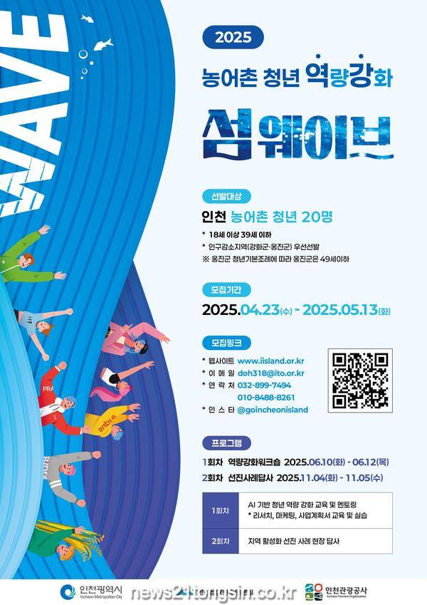 인천광역시(시장 유정복)는 농어촌 지역에서 창업과 정착을 준비하는 청년들을 위한 ‘2025 인천 농어촌 청년 역량강화 프로그램 지원’ 사업의 참여자를 오는 5월 13일까지 모집한다고 밝혔다.