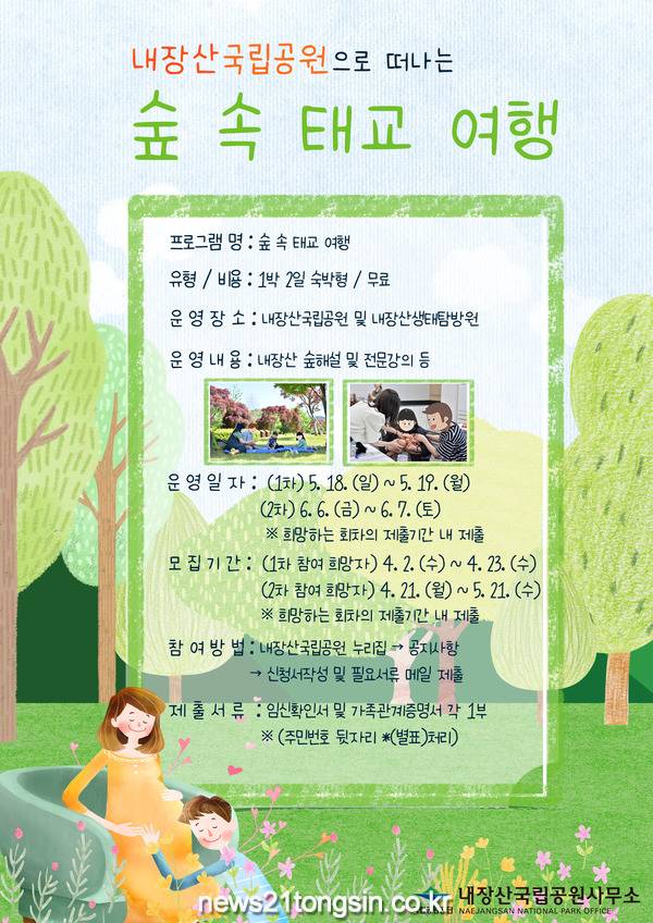 [뉴스21통신전북취재팀]국립공원공단 정읍내장산국립공원은 임신부와 보호자 등 가족 대상 ‘내장산 숲 속 태교 여행’ 프로그램을 운영한다.