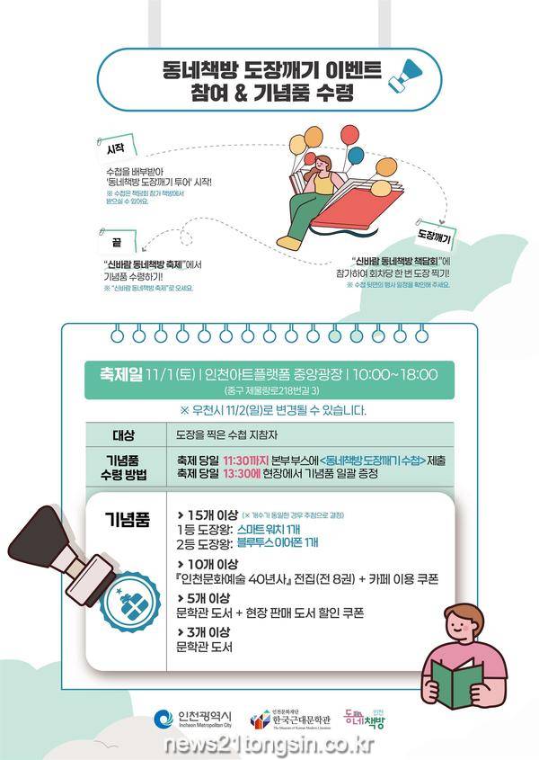 ○ 축제를 더욱 풍성하게 즐기고 싶다면, 책담회와 연계해 진행되는 ‘동네책방 도장깨기 이벤트’에 주목할 만하다. 책담회에 참석할 때마다 책방 도장을 받을 수 있으며, 도장 개수에 따라 인천문화재단 및 한국근대문학관 발간 도서, 카페 이용권, 도서 할인 쿠폰 등 다양한 경품이 제공된다. 특히 책방 도장을 15개 이상 모은 참여자에게는 추첨을 통해 스마트워치, 블루투스 이어폰 등의 경품을 제공할 예정이다.