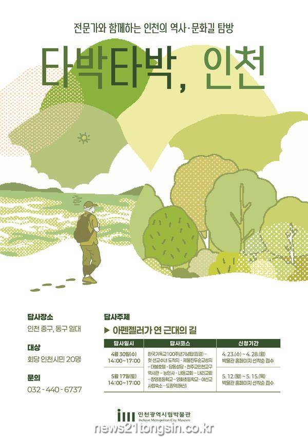 20세 이상 시민 누구나 참가할 수 있으며, 답사비는 무료다. 참가 신청은 4월 23일부터 인천시립박물관 누리집을 통해 가능하며, 회차당 20명씩 선착순으로 모집한다.