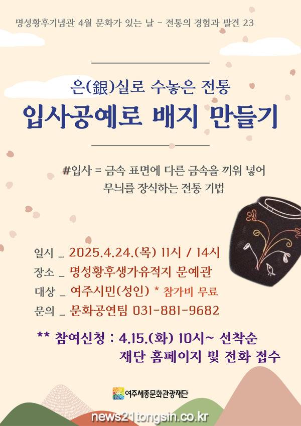 이순열 여주세종문화관광재단 이사장은 “입사공예는 단단한 금속 위에 또다른 금속을 수놓는 장인의 공력을 바탕으로 세밀함과 화려함의 극치를 보여주는 전통문화이다.”라며 “이번 4월 문화가 있는 날을 통해 이러한 입사공예의 전통을 경험하는 귀중한 시간이 되길 바란다.”고 밝혔다.