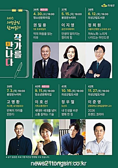 의성군(군수 김주수)은 오는 4월 30일부터 건강, 소통, 독서 등 다양한 분야의 저명한 작가들과 함께하는 ‘2025 의성군민 함께읽기 작가를 만나다’ 프로그램을 운영한다고 밝혔다.