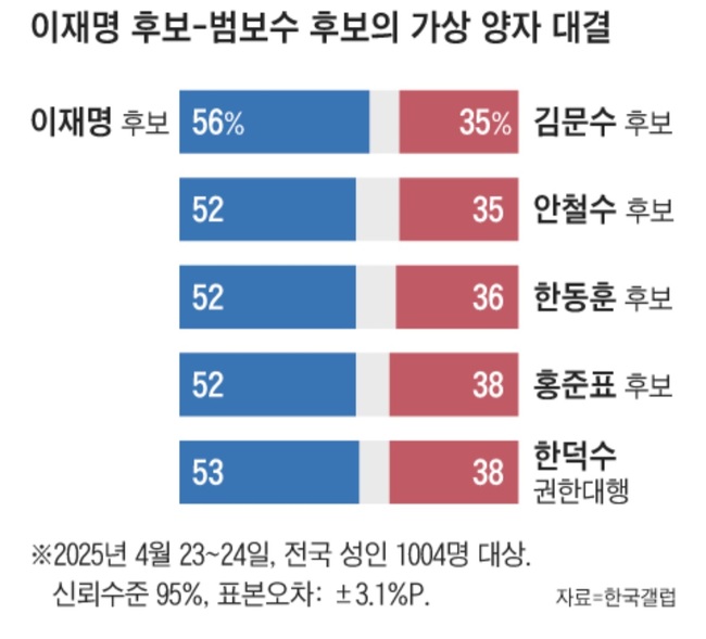 양자 대결때 李 50%대... 韓대행·洪 38%, 韓 36%, 金·安 35% [갤럽]