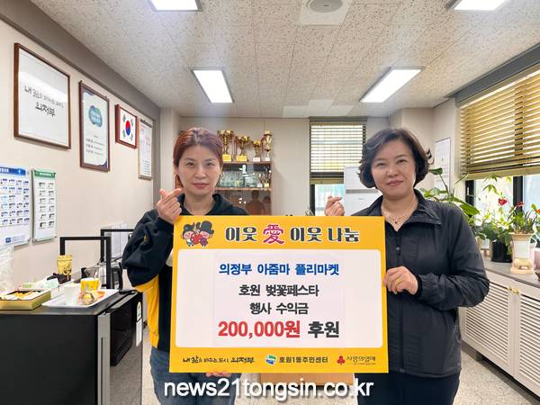 ▲ 사진=의정부시의정부시 호원1동주민센터(동장 고연희)는 의정부아줌마플리마켓(대표 배미영, 이하 의아플)이 벚꽃축제에서 발생한 수익금 20만 원을 기탁했다고 28일 밝혔다.