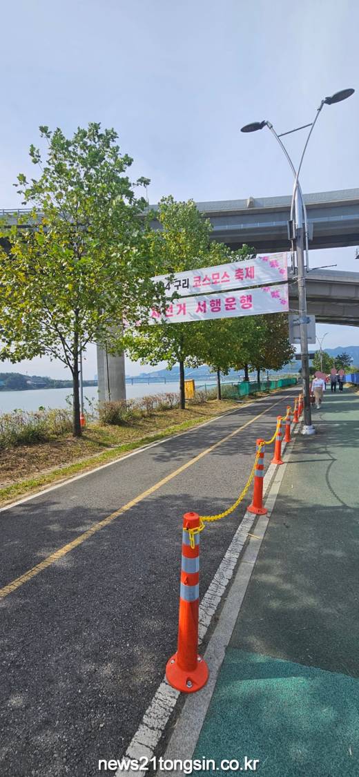▲ 사진=구리시구리시(시장 백경현)는 안전한 <2025 구리 유채꽃 축제> 운영을 위해 보행로와 자전거도로를 구분하는 시설물인 차선규제봉과 체인 등을 한강시민공원 주차장부터 유채꽃 단지 입구로 연결되는 고덕토평대교 하부까지 약 1km 구간에 설치한다고 밝혔다.