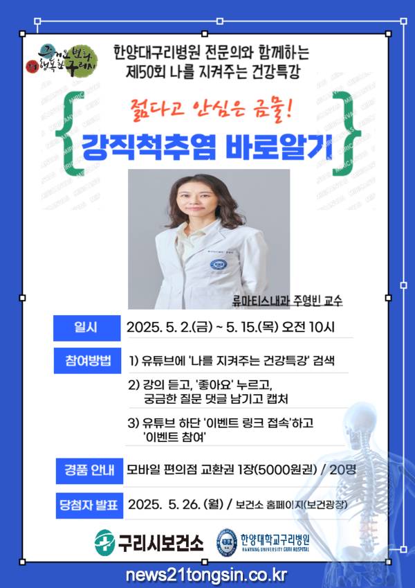 ▲ 사진=구리시구리시(시장 백경현)는 한양대구리병원과 협력하여 오는 5월 2일, <나를 지켜주는 건강특강>으로 주영빈 류마티스내과 교수의 ‘젊다고 안심은 금물! 강직척추염 바로 알기’를 구리시 공식 유튜브 채널인 구리비전을 통해 송출한다고 밝혔다.