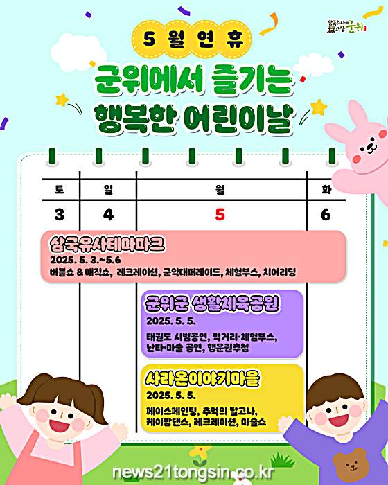 군위군(군수 김진열)은 오는 5월 어린이주간을 맞아 제103회 어린이날을 기념해 다채로운 행사를 개최한다고 밝혔다.