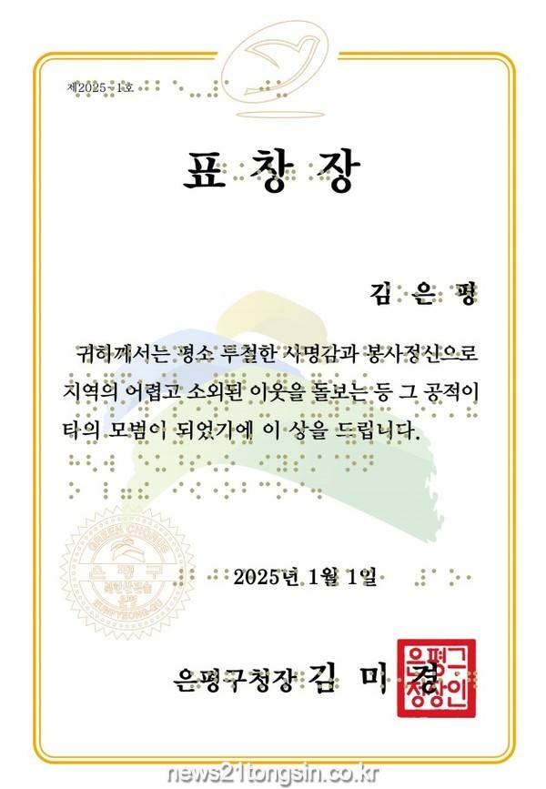 서울 은평구(구청장 김미경)는 시각장애인과 외국인 수상자도 차별 없이 존중받을 수 있도록 ‘점자·외국어 병기 표창장’을 서울시 자치구 최초로 도입한다고 밝혔다.