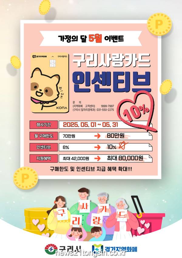 ▲ 사진=구리시구리시(시장 백경현)는 5월 가정의 달을 맞아 구리사랑상품권(구리사랑카드) 특별 인센티브를 월 80만원 한도 내에서 10%로 확대 지원한다고 밝혔다.