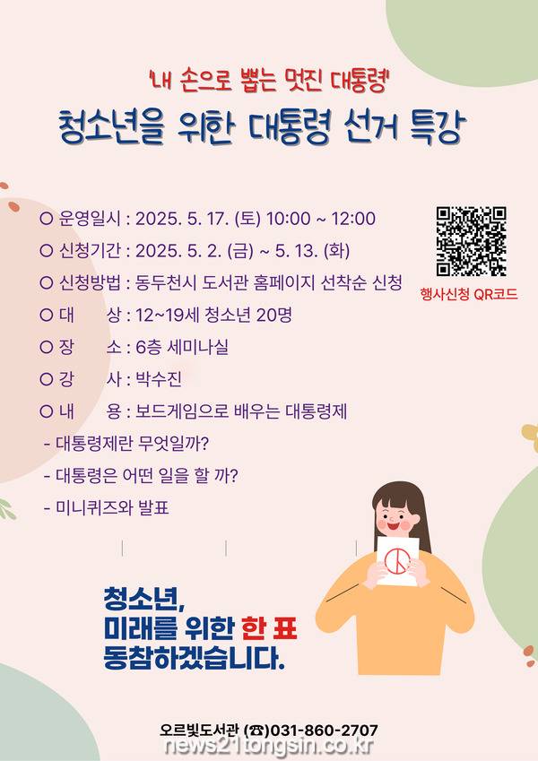▲ 사진=동두천시오르빛도서관은 5월 17일 6층 세미나실에서 청소년을 대상으로 민주시민 교육 프로그램인 ‘대통령 선거 특강’을 운영한다고 밝혔다.