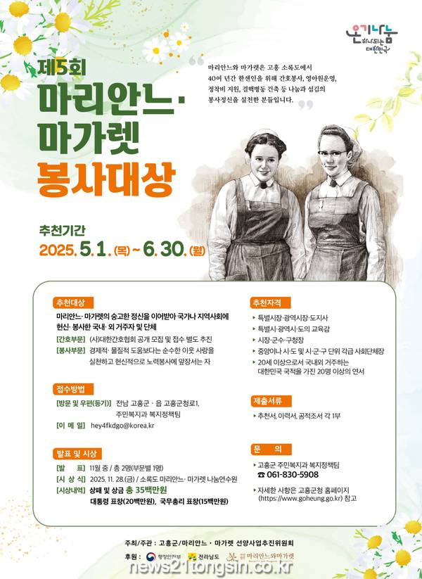고흥군(군수 공영민)은 소록도에서 40여 년간 나눔과 헌신의 삶을 실천한 마리안느와 마가렛 두 간호사의 숭고한 정신을 계승·발전시키고, 봉사 가치의 사회적 인정 강화를 위해 ‘제5회 마리안느·마가렛 봉사대상’ 후보자를 오는 6월 30일까지 추천 공모한다.