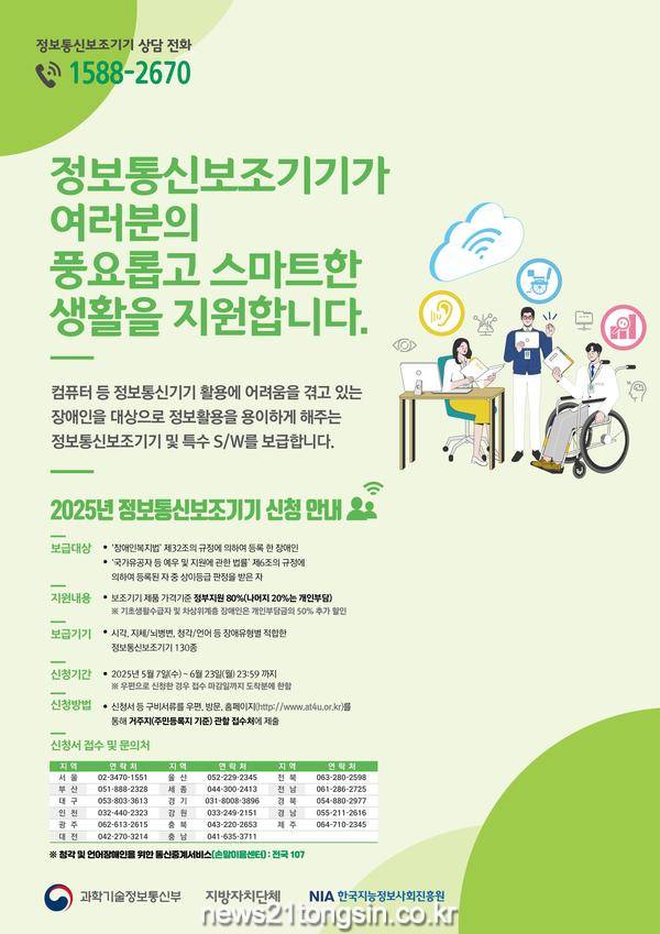 신청 기간은 5월 7일부터 6월 23일까지로 정보통신보조기기 누리집(www.at4u.or.kr)을 통해 온라인으로 신청할 수 있으며, 주소지 관할 군․구 정보화 부서 방문 또는 우편으로도 접수할 수 있다.