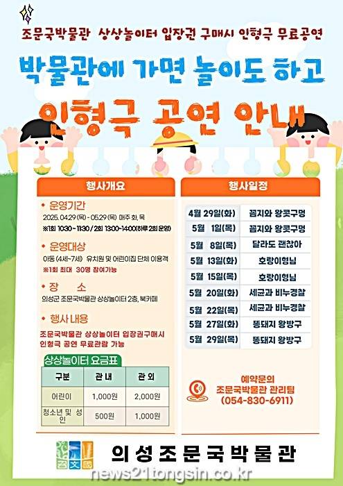 ‘2025년 박물관에 가면 놀이도 하고’는 올해 처음으로 시행되는 프로그램으로 5월 29일까지 매주 화요일과 목요일에 운영된다.(공휴일 제외) 참여 대상은 의성조문국박물관 상상놀이터 입장권을 구매한 단체방문객이며, 놀이체험은 1층 모험의성(에어포켓, 정글짐 등), 인형극은 2층 북카페에서 무료로 진행된다.