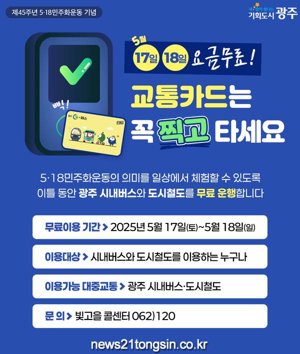 광주광역시는 제45주년 5·18민주화운동을 기념해 5월 17일과 18일 이틀간 시내버스와 도시철도 전 노선을 무료로 운행한다.