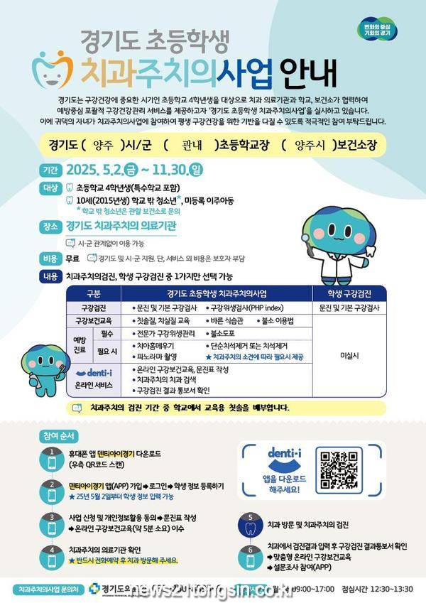 참여를 원하는 학부모와 학생은 덴티아이경기 앱을 휴대전화에 설치한 후 ➊개인정보 동의 ➋문진표 작성 ➌온라인 구강보건교육 이수를 완료하고, ➍양주시 관내 치과주치의 지정 의료기관을 확인한 뒤 ➎전화 예약 후 방문하면 된다.