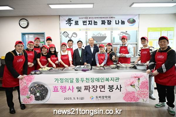 ▲ 사진=동두천시동두천시장애인종합복지관(관장 김종학)은 9일 어버이날을 맞아 동두천시도비장학회(회장 송인정)와 함께 ‘孝로 번지는 짜장 나눔’ 행사를 진행했다.