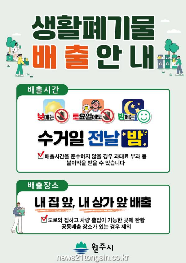 원주시는 깨끗한 도시환경을 조성하고 시민의 생활편의를 증진하기 위해 생활폐기물 배출 시간 준수 캠페인 ‘낮·토·밤’을 실시하며 분리배출 방법을 적극적으로 홍보에 나서고 있다.
