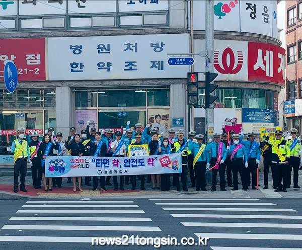 전북특별자치도 정읍경찰서가 13일 고려병원사거리에서 타면 “착” 안전도“착”이라는 표어로 안전띠 착용 문화 확산을 위한 캠페인 활동을 펼쳤다.