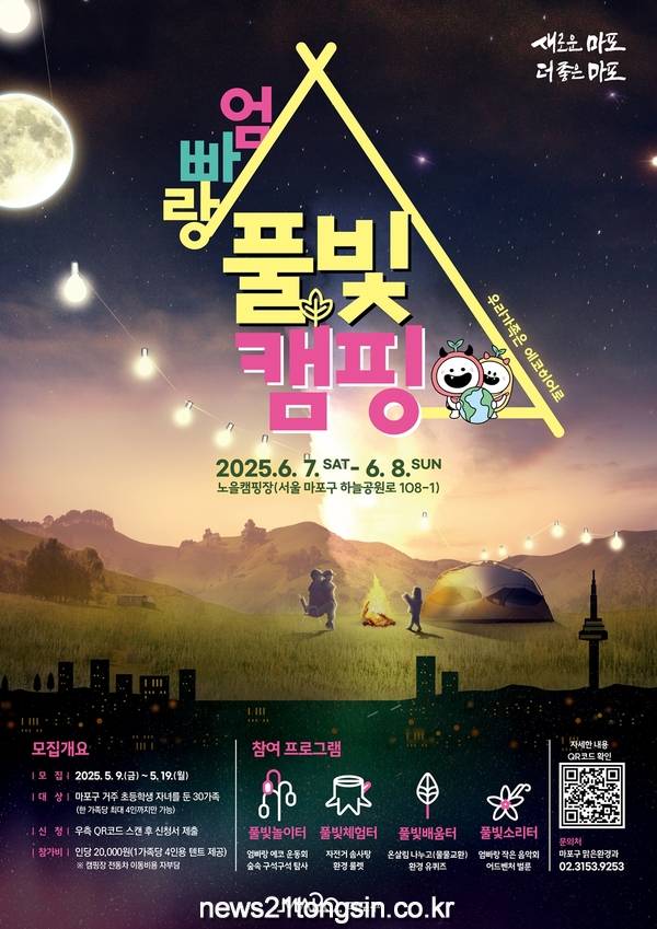 마포구(구청장 박강수)는 환경의 달 6월을 맞아 관내 초등학생 자녀를 둔 가족을 대상으로 ‘마포 엄빠랑 풀빛캠핑’ 참가자를 5월 19일까지 모집한다.