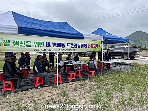 군위군은 16일 지역 내 항공방제사, 농업인 35명을 대상으로 효령면 성리에서 드론 공동방제 기술교육을 실시했다.