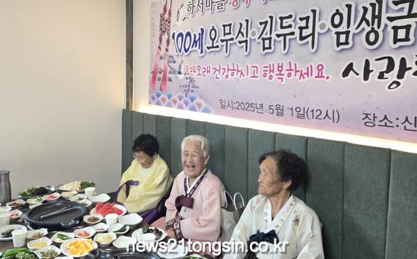 20일 울주군에 따르면 지난 1일 온양읍 하서마을에서 열린 어버이날 행사에 100세가 넘는 어르신 3분이 참석해 백수 기념식을 가졌다.