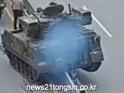 ▲ 사진=kbs뉴스 영상 캡쳐장갑차 한 대가 도로 중앙분리대 위에 위태롭게 멈춰 서 있다.