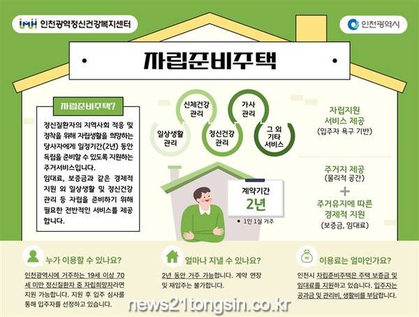 사업은 인천시 수탁기관인 인천광역정신건강복지센터가 총괄 운영하며, 기초정신건강복지센터, 정신재활시설 등 다양한 기관과 협업해 자립지원 프로그램을 운영, 정신응급상황관리, 동료지원가 상담 등을 제공할 예정이다.