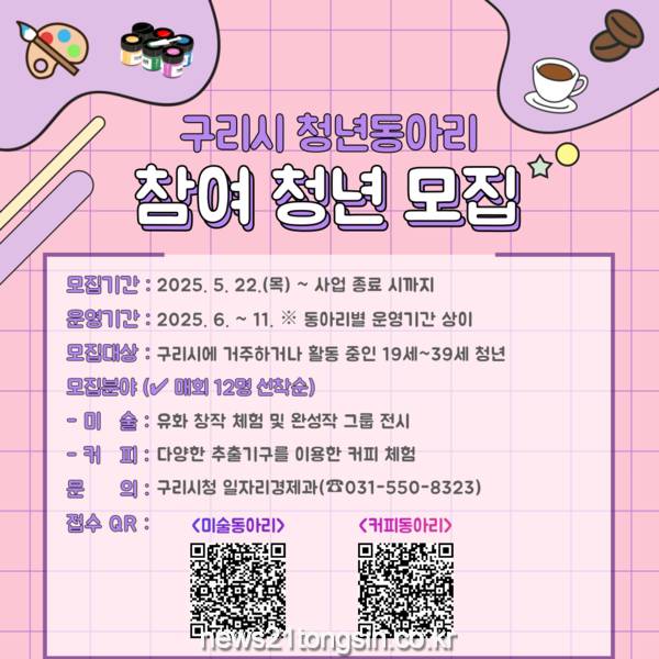 ‘구리시 청년동아리’는 청년들의 창의적이고 자율적인 활동을 지원하기 위한 사업으로, 올해 모집 분야는 ▲미술 활동과 예술적 교류를 중심으로 한 미술동아리 ▲다양한 추출 기구를 활용한 체험 중심의 커피 동아리이다.