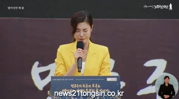 노무현 전 대통령 서거 16주기 추도식을 진행하던 김규리 배우가 눈물을 쏟아냈다. 추도식에 앞서 참배한 이재명 더불어민주당 대통령 후보도 눈물을 훔쳤다.
