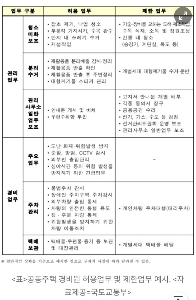 이에 따라 규정된 경비 업무 외 수행할 수 있는 업무는 ▲청소와 이에 준하는 미화의 보조 ▲재활용가능자원의 분리배출 감시 및 정리 ▲안내문의 게시와 우편수취함 투입이다.