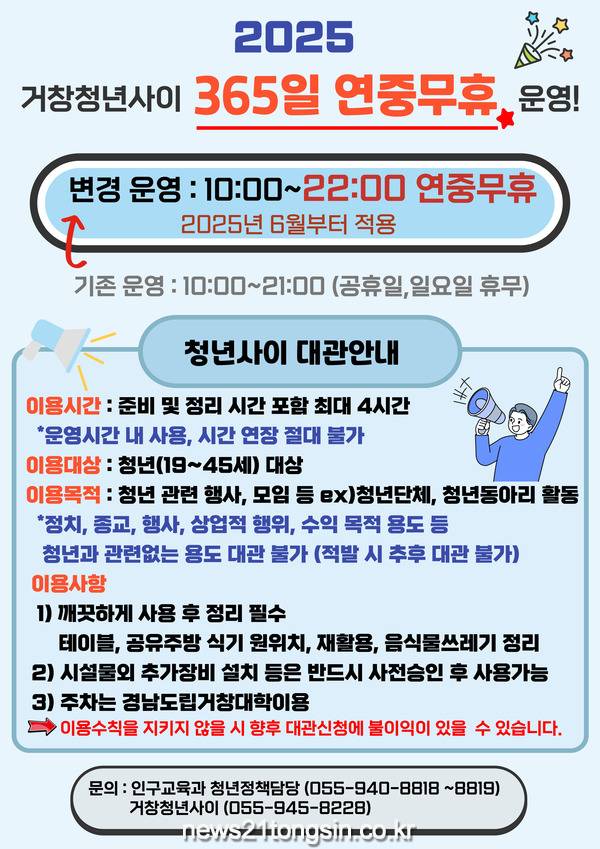 거창청년사이는 청년을 위한 맞춤형 공간으로, 운영 관련 자세한 정보는 거창청년사이 누리집을 통해 확인할 수 있다.