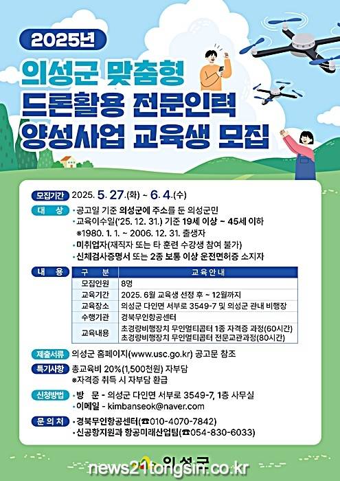 의성군(군수 김주수)은 드론 기술 기반의 인재를 육성하기 위해 ‘2025년 맞춤형 드론활용 전문인력 양성사업’을 본격적으로 추진한다고 밝혔다.