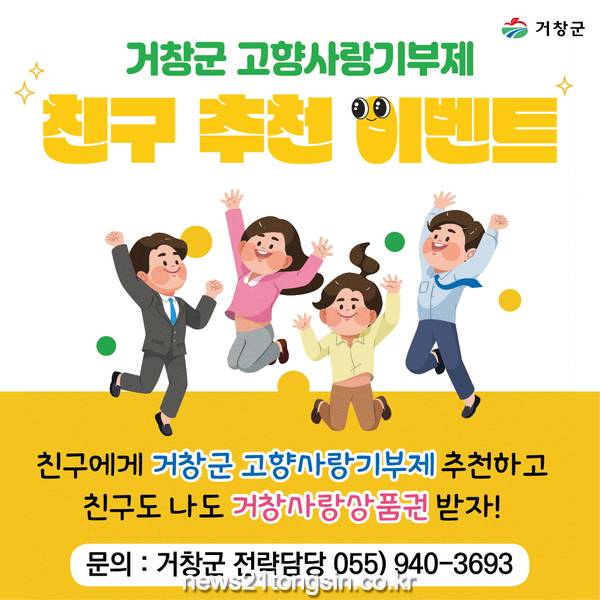 거창군은 고향사랑기부제에 대한 관심도를 높이고 참여를 확대하기 위해 6월 1일부터 30일까지 거창군 고향사랑기부제 친구 추천 이벤트를 진행한다고 30일 밝혔다.