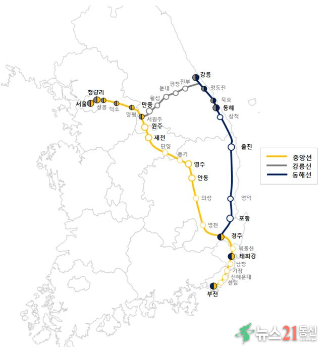 [뉴스21 통신=최세영 ]▲ 노선도제공=울산광역시울산시는 12월 30일부터 청량리역에서 울산을 거쳐 부전역으로 가는 중앙선 케이티엑스(KTX)-이음이 증편 운행됨에 따라 태화강역 정차횟수가 기존 6회에서 18회(주말 18회, 평일 16회)로 대폭 확대되고, 북울산역 4회, 남창역 2회 격역 정차가 확정됐다고 15일 밝혔다. 아울러, 강릉에서 태화강역을 ...