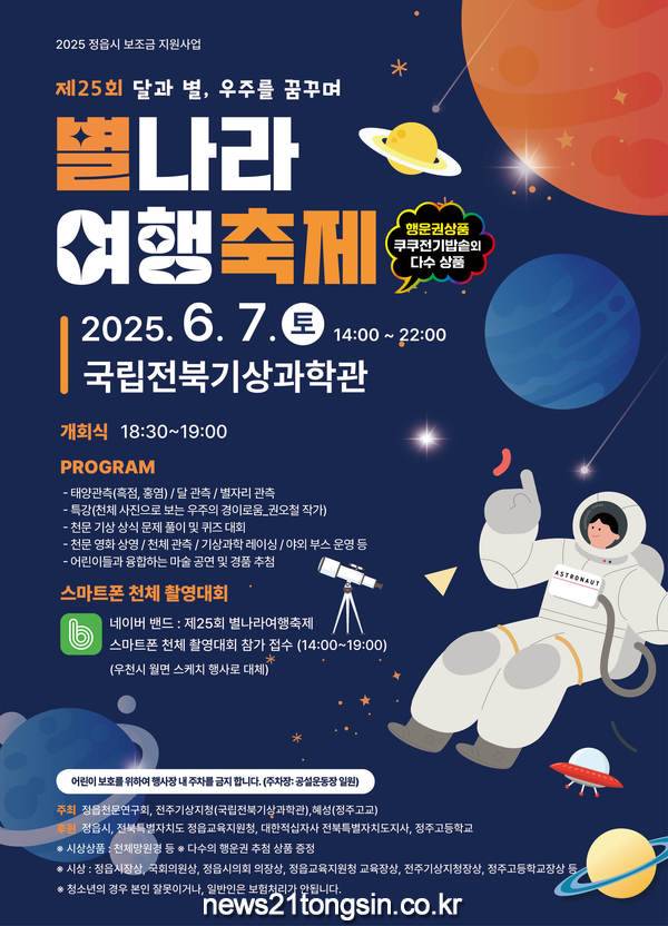 정읍시는 오는 7일 오후 2시부터 밤 10시까지 국립전북기상과학관에서 지역 대표 과학문화축제인 ‘별나라 여행축제’를 개최한다.