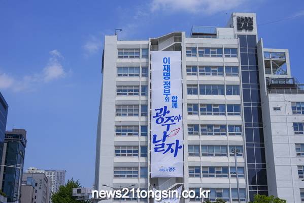 광주시는 이날 오전 광주시청사와 전일빌딩245 외벽에 ‘이재명 정부와 함께 광주야 날자’ 문구가 적힌 대형 현수막을 내걸었다.