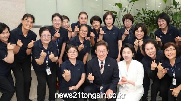 이 대통령은 “안녕하세요” 하며 고개를 숙였고 청소 노동자들의 손을 일일이 잡으며 인사했다. 이 대통령이 김혜경 여사와 함께 악수하며 “고맙습니다” 인사를 하자 청소 노동자들은 “팬입니다”, “잘 부탁합니다” 답하며 웃었다. 이날 인사가 끝나고 기념 촬영을 할 때 이 대통령은 먼저 무릎을 낮추고 자세를 취했다.