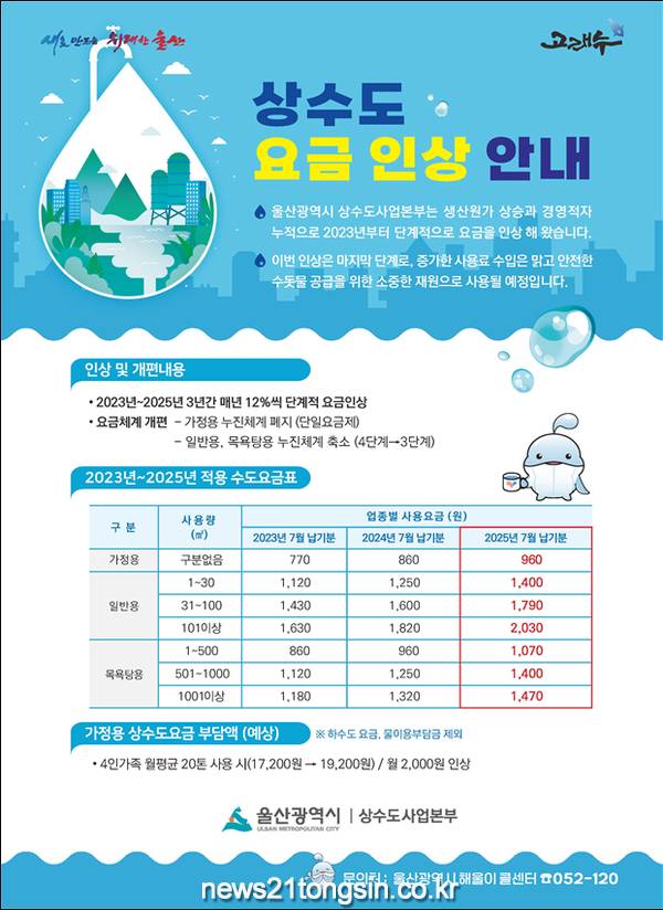 울산시 상수도사업본부는 안정적인 수돗물 공급과 노후 수도시설의 현대화를 위해 지난 2023년부터 단계적으로 추진해 온 상수도 요금 인상 계획의 마지막 단계가 오는 7월 고지분부터 적용된다고 밝혔다.