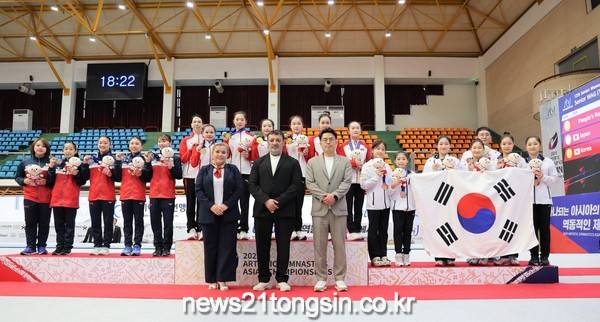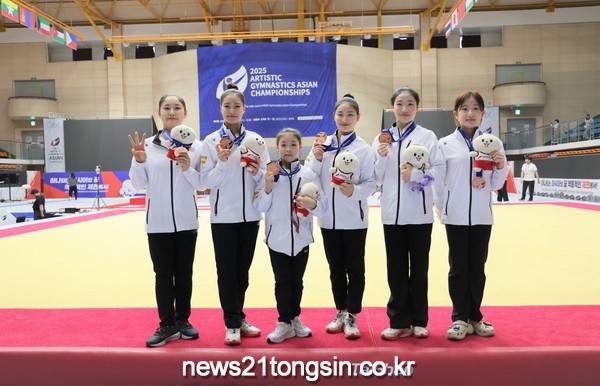 ▲ 한국 여자 기계체조 대표팀이 2025 기계체조 아시아선수권대회에서 단체전 동메달을 획득했다.‘2025 기계체조 아시아선수권대회’ 여자부 경기가 6월 12일(목), 충북 제천체육관에서 본격적인 막을 올렸다. 아시아 18개국의 대표선수들이 참가한 이번 대회는 각국의 수준 높은 기량이 펼쳐지며 뜨거운 열기를 더하고 있다.