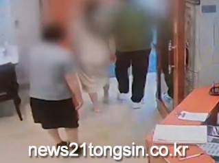 넘어질 듯 휘청거리는 여성을 직원이 부축하고, 곧이어 같이 있던 남성이 끌고 나간다.