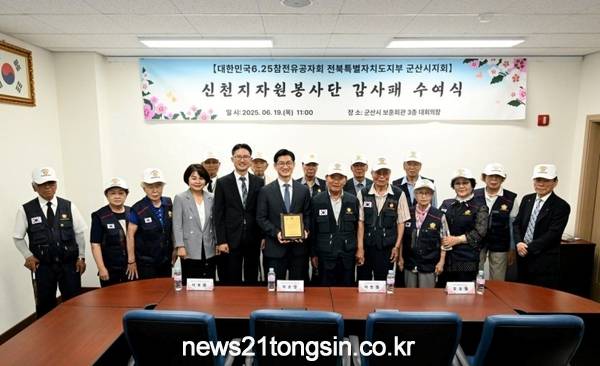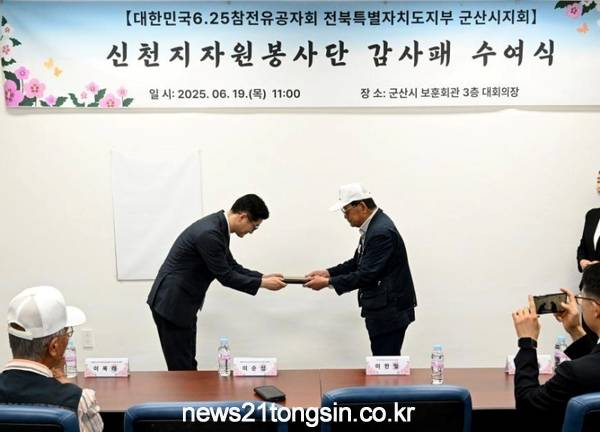 대한민국 6.25참전유공자회 전북특별자치도지부 군산시지회(회장 이순성)가 신천지자원봉사단 전북연합회(연합회장 최중일·이하 전북연합회)에 19일 감사패를 전달했다.