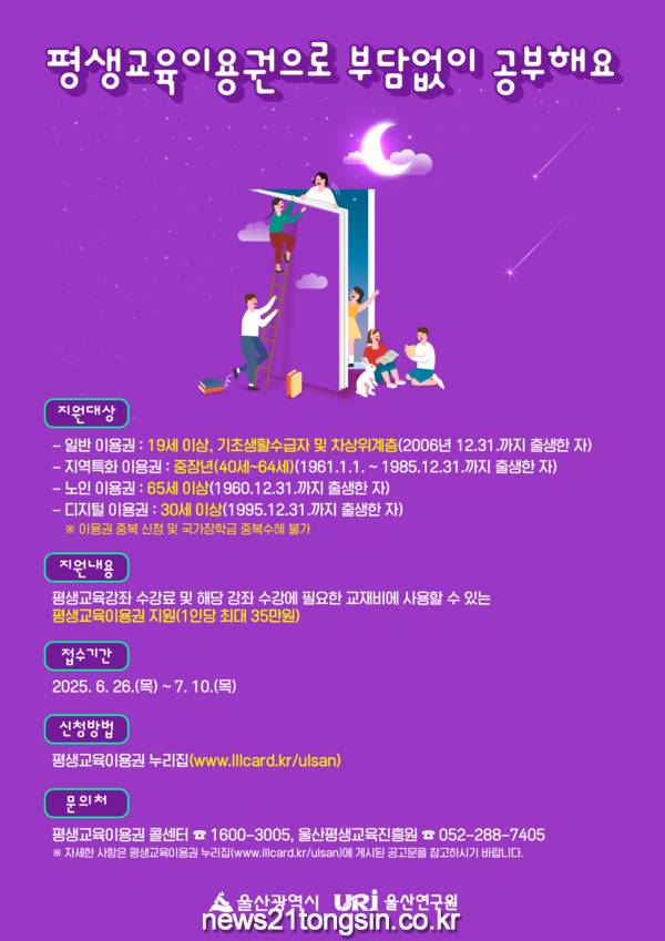(뉴스21통신/우정석기자) = 울산시는 교육 사각지대 해소와 시민 평생학습권 보장을 위해 추진 중인 ‘2025년 평생교육이용권’ 지원 사업이 2차 신청 접수에 들어간다고 밝혔다.