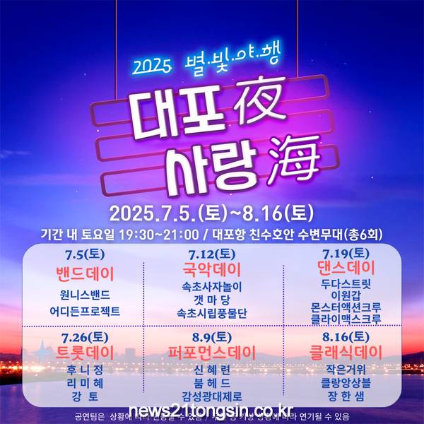 이병선 속초시장은 “대포항의 밤을 수놓을 특별한 여름 공연을 통해 지역 예술인을 지원하고, 관광객들에게는 머물고 싶은 속초의 매력을 전달하고자 한다”며, “시민과 관광객 모두가 함께 즐기는 열린 무대가 되길 바란다”라고 전했다.